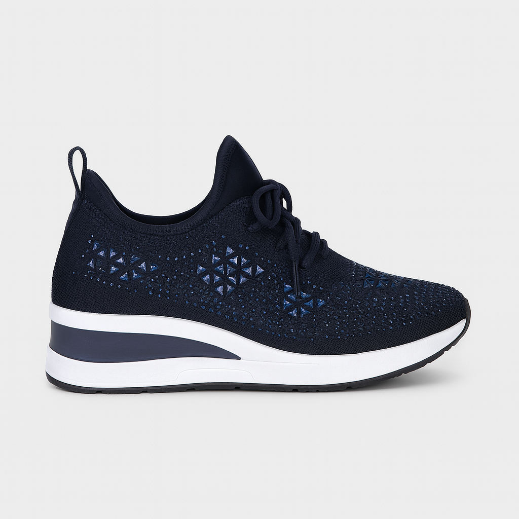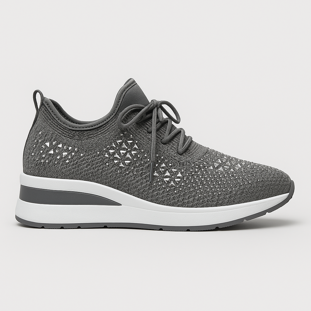 Gisela™ são ténis pensados para quem quer bem-estar o dia todo sem abdicar de estilo. A palmilha ortopédica apoia o arco do pé, reduz o impacto e promove uma passada natural, enquanto as aplicações de brilhantes acrescentam um detalhe glam que eleva qualquer look — do casual ao sporty-chic.