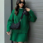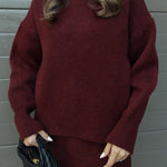 Silhueta que favorece: blusa levemente solta e saia com queda elegante.